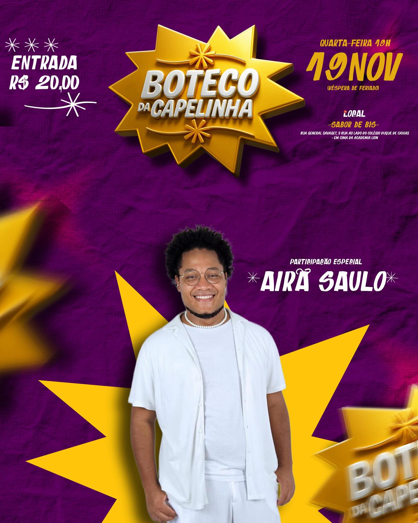 E pra comandar tudo isso, o Airã Saulo estará garantindo a sarau com muito som na véspera de feriado!
