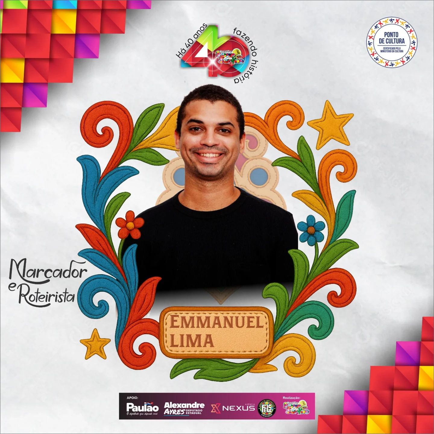 Ator, dramaturgo, professor de teatro e produtor cultural, Emmanuel é o responsável dos roteiros da Luar de 2022 a 2025, e agora escreve mais um capítulo dessa história luminosa que mistura arte, tradição e emoção.